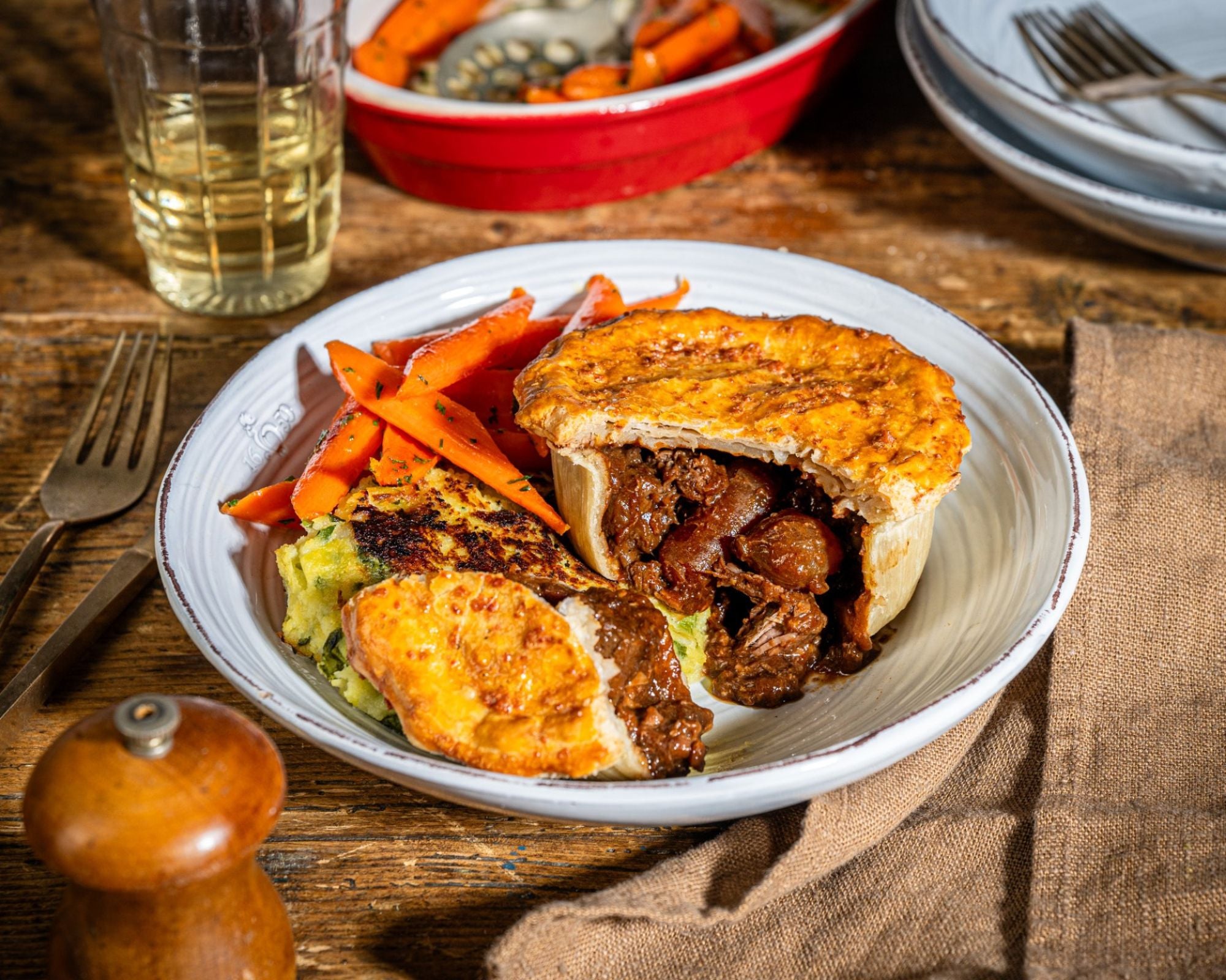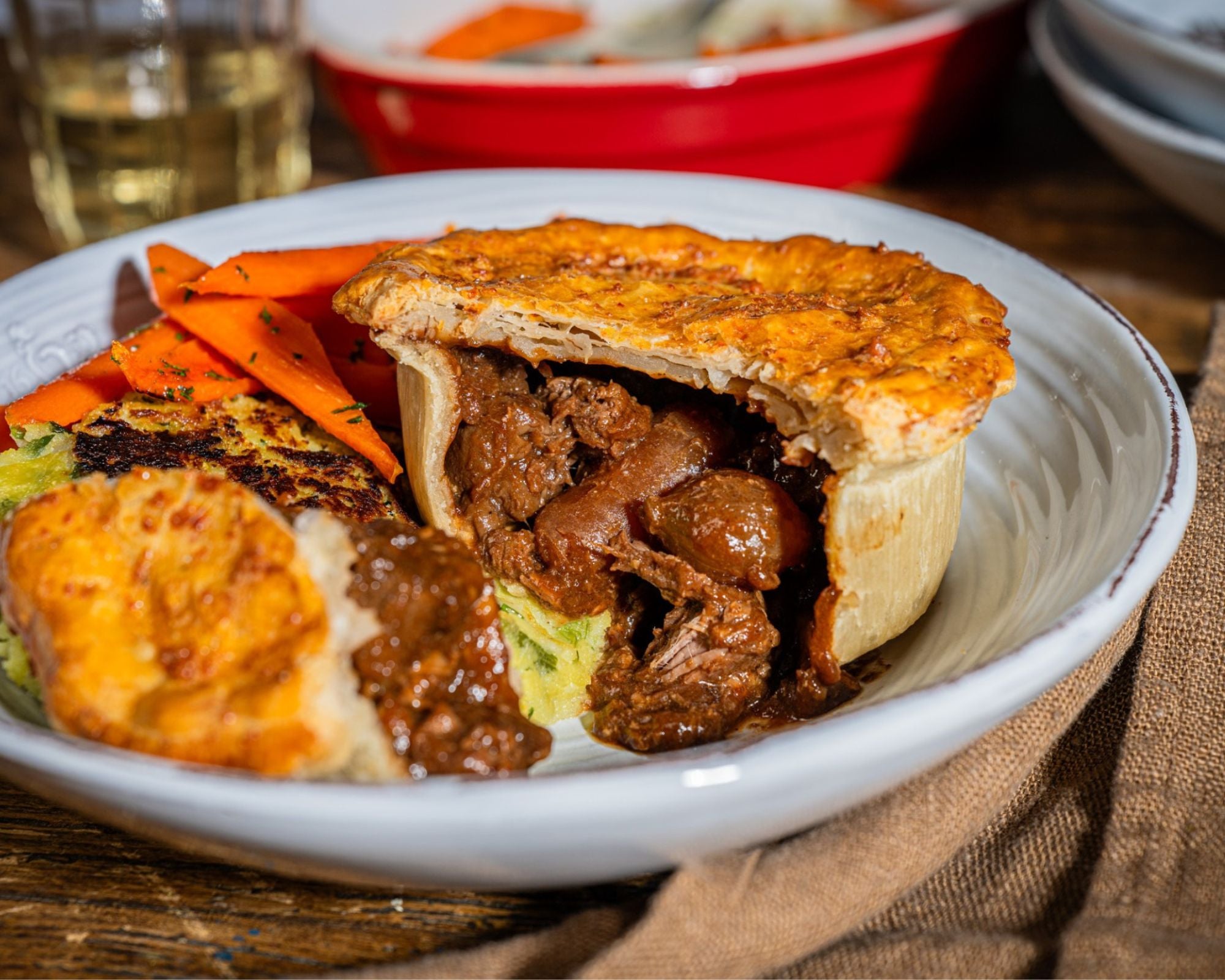 At its heart is tender, slow-cooked beef, gently braised in red wine with silver skin onions, Chantenay carrots and mushrooms until rich and deeply savoury. Pancetta adds a subtle sweetness and depth, while a delicate balance of herbs bring warmth and balance to every bite.
